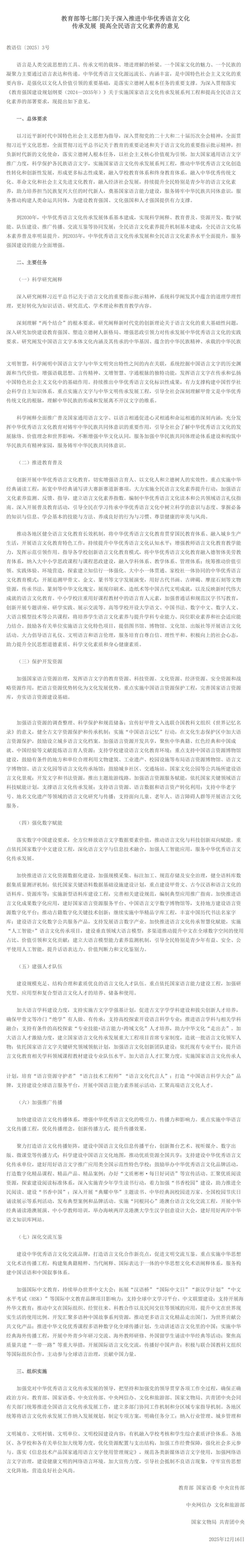 教育部等七部门关于深入推进中华优秀语言文化传承发展 提高全民语言文化素养的意见